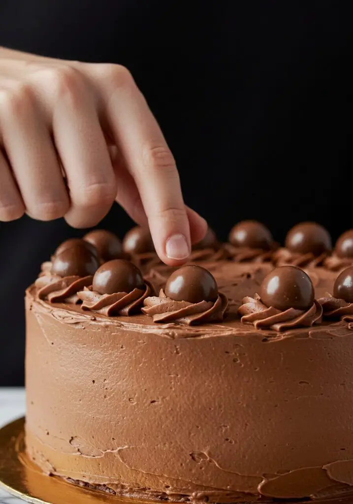 - Add the Maltesers: Now for the fun part! Starting at the very bottom edge of the cake, begin pressing the Maltesers, one by one, into the icing. Work your way all the way around the cake to create the first layer. Then, start the next layer, resting the Maltesers on the layer below. Continue this process up the sides and then on the top, working in circles towards the middle, until the entire cake is completely covered in a beautiful cascade of Maltesers.
