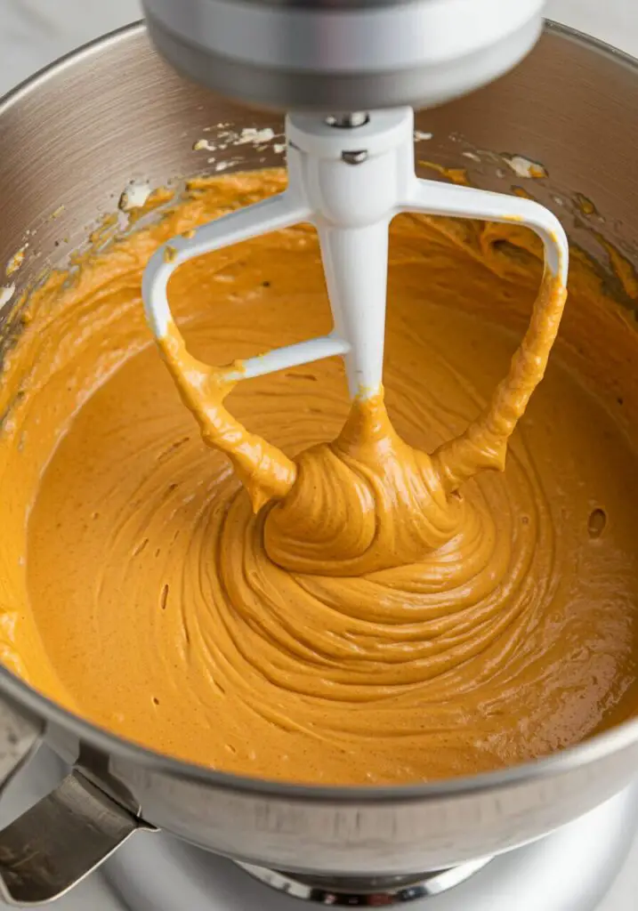 - Prepare filling: Beat cream cheese and pumpkin puree with a stand mixer on medium speed until smooth, about 2 minutes. Add sugar and vanilla, beating until combined. Add eggs, 1 at a time, beating just until incorporated. Add spices and beat for 30 seconds.