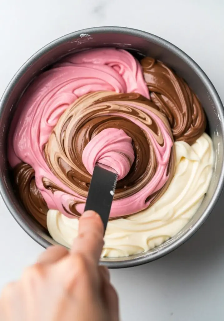- Marble and Bake: Place alternating dollops of the three batters into each of the four prepared pans. Use a butter knife to gently swirl the batters together once or twice to create a marbled effect. Bake for 25-30 minutes, or until a toothpick inserted in the center comes out clean. Cool completely on a wire rack, then level the tops with a serrated knife.