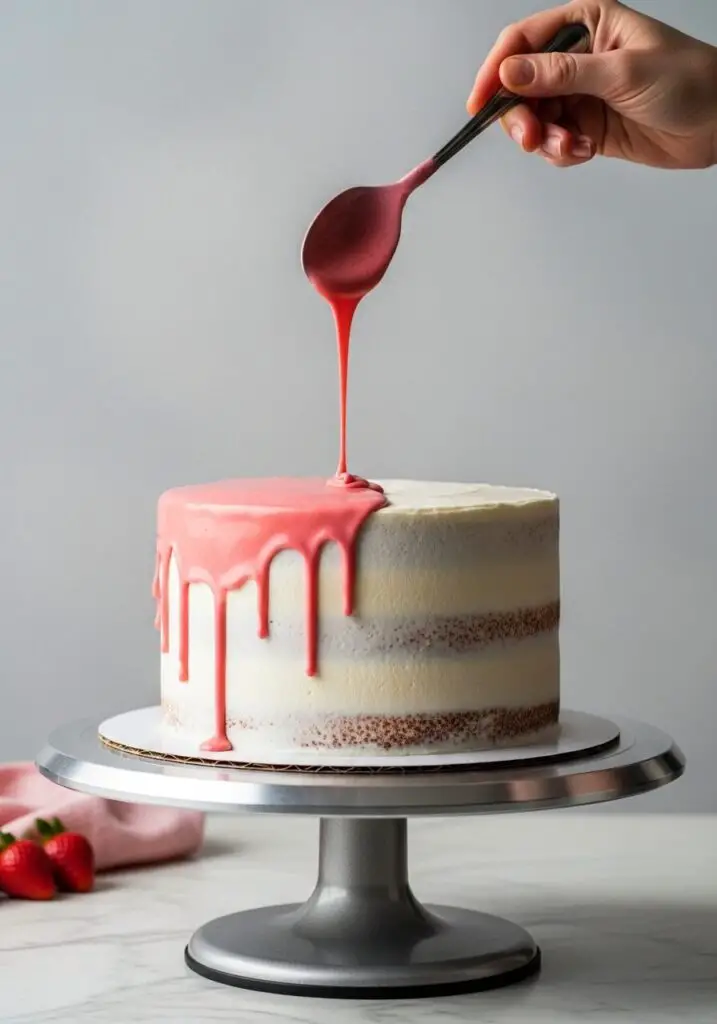 - Apply the Drip: Remove the chilled cake from the fridge. Spoon the ganache around the top edge of the cake, gently nudging it over the side to create drips. Then, pour the remaining ganache in the center and spread it to the edges.