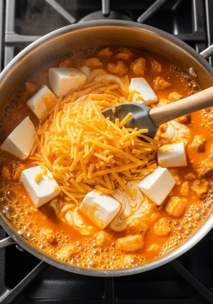 - Heat the Base. In a large saucepan over medium-high heat, combine the drained and shredded canned chicken and the entire bottle of hot sauce. Cook for 2-3 minutes, stirring, until it’s heated through.