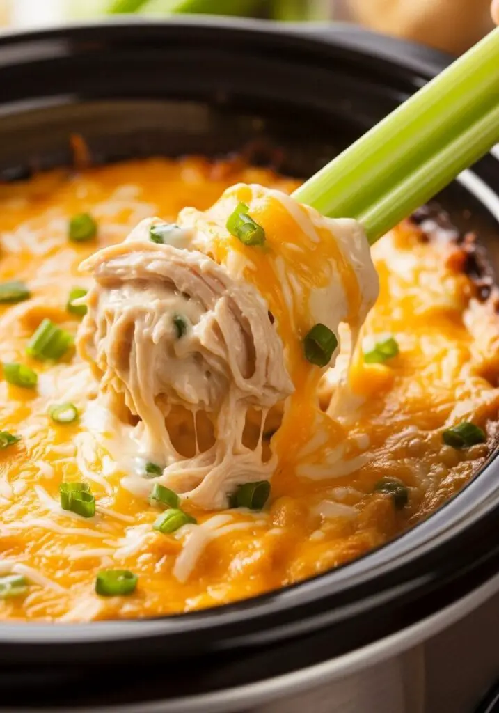 - Garnish and Serve. Garnish the top with a sprinkle of fresh chives or blue cheese crumbles. Arrange your celery sticks, crackers, and tortilla chips around the slow cooker and let your guests enjoy the warm, cheesy goodness all night long!
