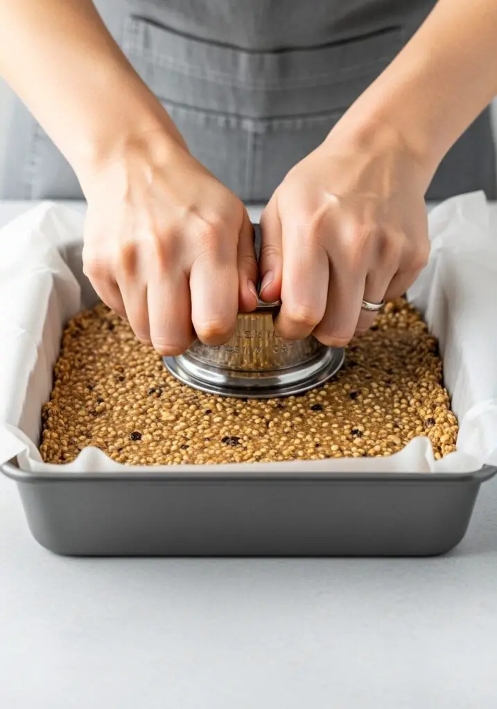 - Press Firmly: Transfer the sticky mixture to your prepared baking pan. Here’s the most important step: press it down FIRMLY and evenly. I like to use the bottom of a measuring cup or glass to really pack it in there. A tightly packed bar is a bar that holds together.