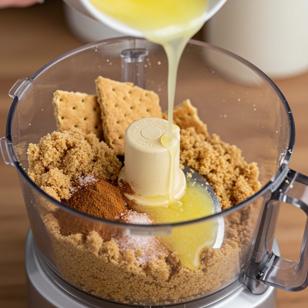 - Make Crust Mixture: Add 1/3 cup packed light brown sugar, ½ teaspoon ground cinnamon, and a pinch of fine salt to the food processor. Pulse briefly to combine. Drizzle in 1 stick (8 tablespoons) melted unsalted butter and pulse again until the mixture looks like wet sand.