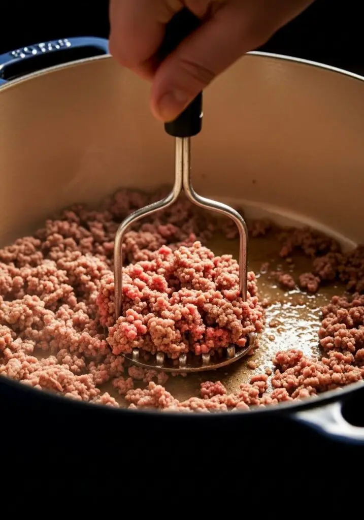 - Brown the Beef (Finely!): Heat a large Dutch oven or soup pot over medium heat. Add the ground beef to the dry pan and cook until it’s thoroughly browned. Here’s the key: use a potato masher or a sturdy spoon to break up the meat into very fine crumbles as it cooks. You’re aiming for a fine texture, not big chunks.