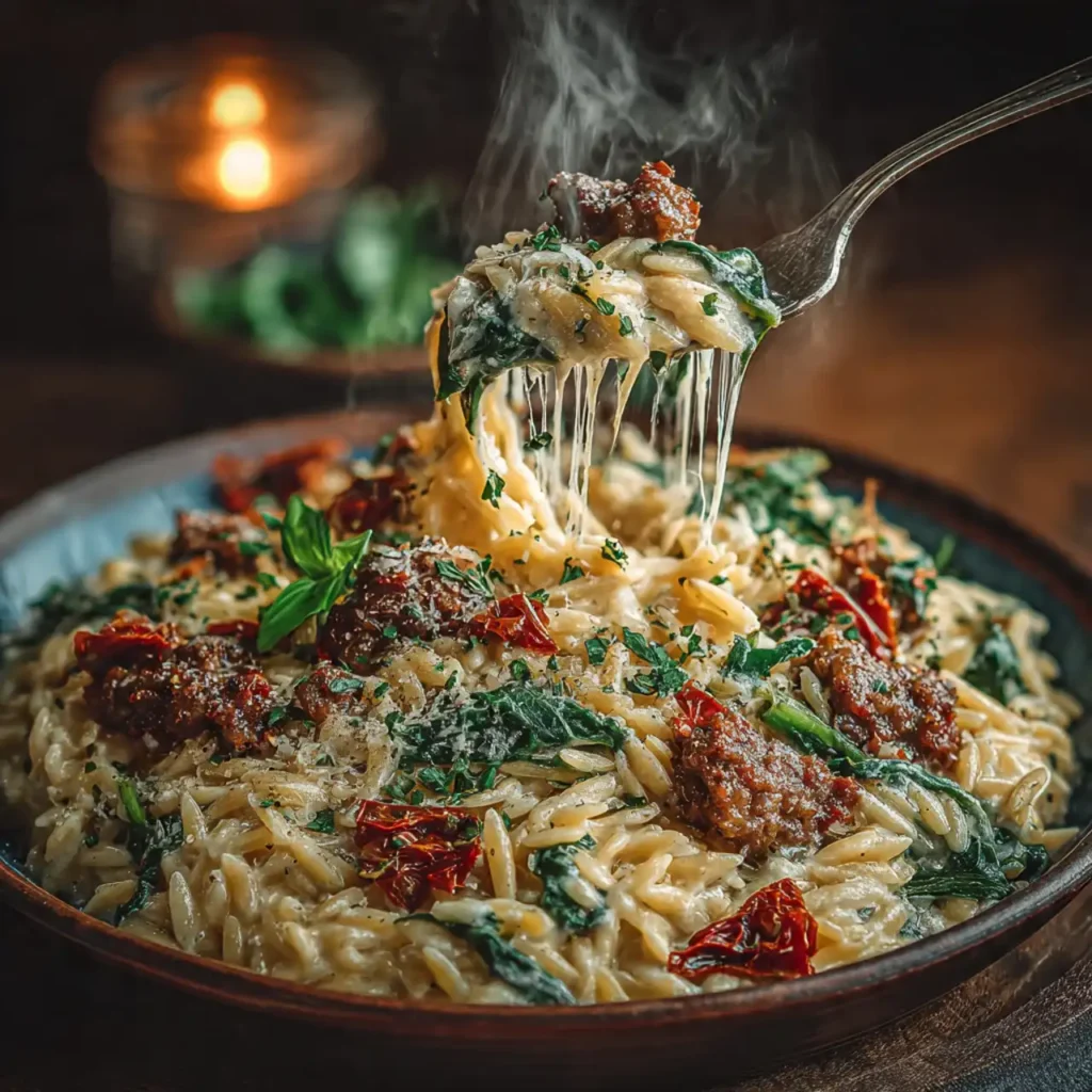 This One-Pot Creamy Sun-Dried Tomato Orzo is the ultimate shortcut to a luxurious winter dinner. By simmering orzo directly in a savory broth, you achieve a velvety, risotto-like texture in just thirty minutes without the constant stirring. The dish is packed with spicy Italian sausage, sweet sun-dried tomatoes, and fresh spinach, all finished with a rich swirl of cream and salty Parmesan. It is a soul-warming, gourmet meal that requires only a single pot and minimal cleanup.