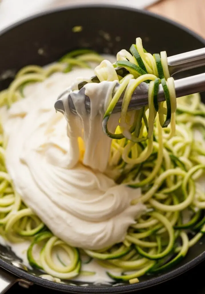 - Toss to Combine. Add the cooked zucchini noodles back into the pan with the creamy alfredo sauce. Use tongs to toss everything together gently until every strand is coated in the luscious sauce.