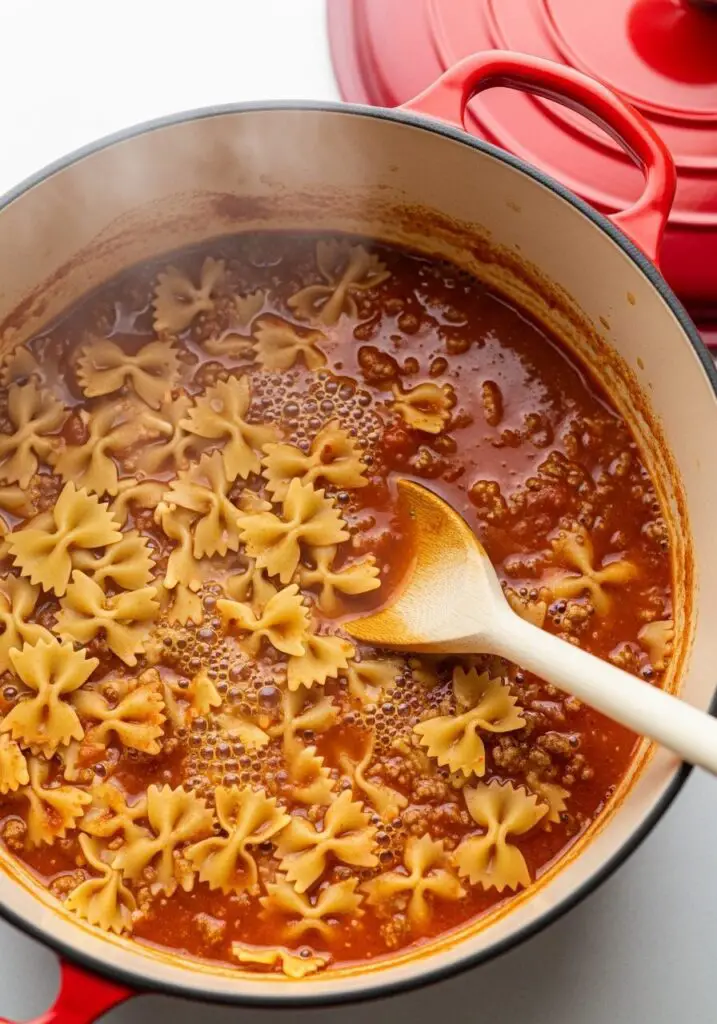 - Add the uncooked bowtie pasta, ensuring it’s covered by liquid. Bring to a boil, then reduce heat and simmer for 10-14 minutes, stirring occasionally, until pasta is tender.