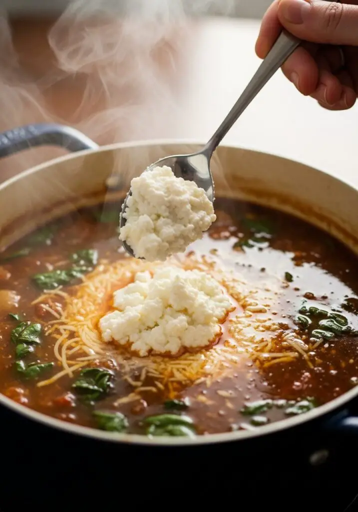 - Stir in the Cheeses and Spinach: Turn the heat to low. Stir in the ricotta cheese, shredded Parmesan, and shredded mozzarella. Continue to stir until the cheeses are melted and the soup is creamy.