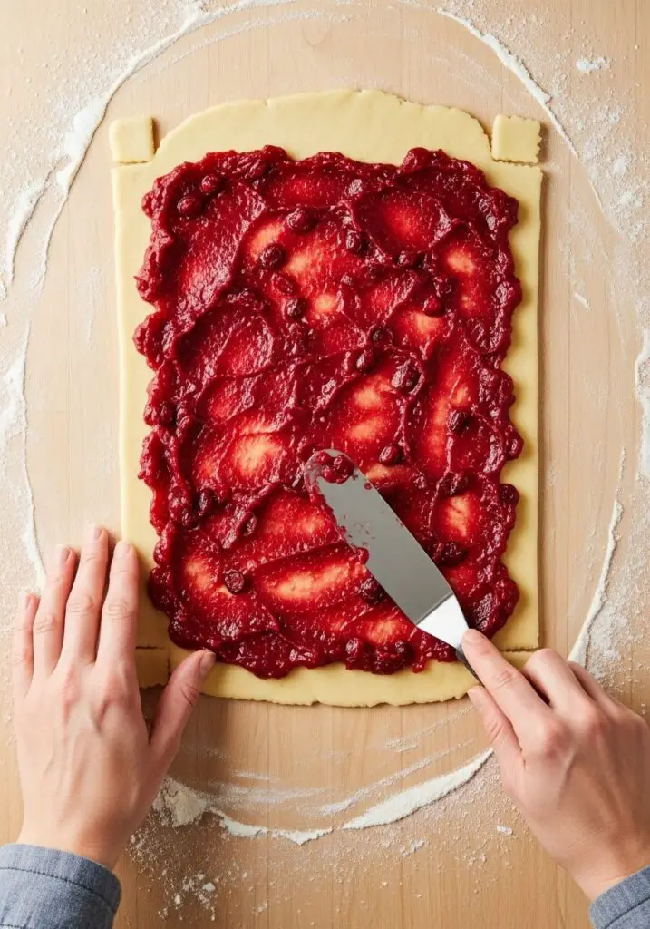 - Spread the Filling: Spread half of the cranberry filling mixture evenly over the dough, leaving a ½-inch border all around the edges.