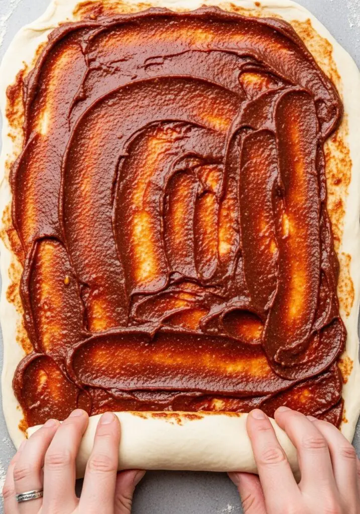 - Roll and Spread: Coat a 9×13-inch baking pan with cooking spray. Turn the risen dough out onto a lightly floured surface. Roll it into a large 18×18-inch square. Spread the cinnamon filling evenly all the way to the edges of the dough.