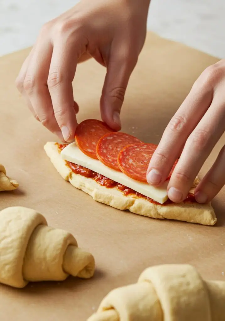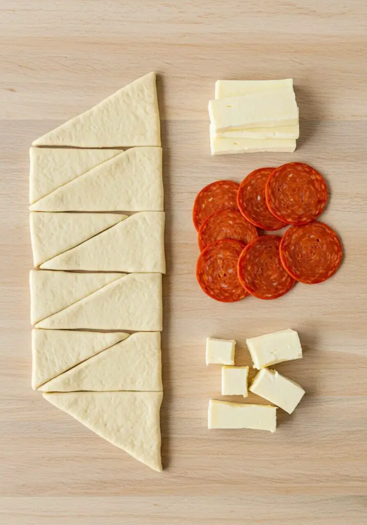 - Layer the Goodness: Working with one triangle at a time, place 4 slices of pepperoni on the wide end of the crescent dough. Top the pepperoni with one half of a mozzarella cheese stick.