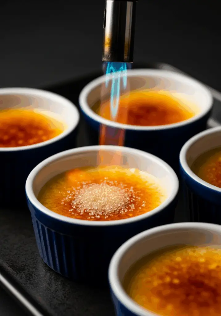 - The “Brûlée”!: Just before serving, blot any condensation from the top of the chilled custards. Sprinkle a thin, even layer of granulated sugar (about 1-2 teaspoons) over the top of each one. Using a kitchen torch, move the flame continuously over the sugar until it melts, bubbles, and caramelizes into a beautiful, amber-colored, glassy crust.