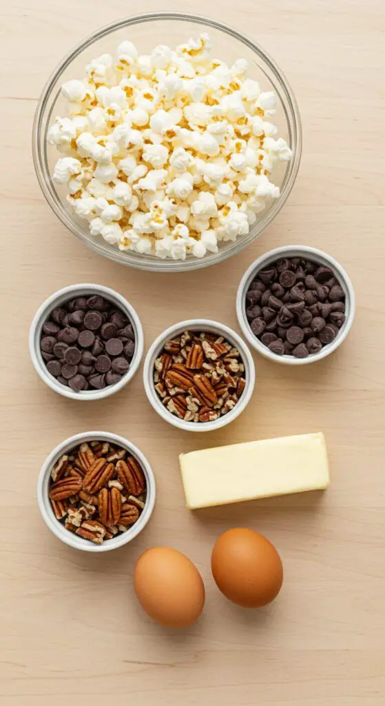 - Gently stir in the lightly crushed popcorn, the chocolate chips, and the chopped pecans.