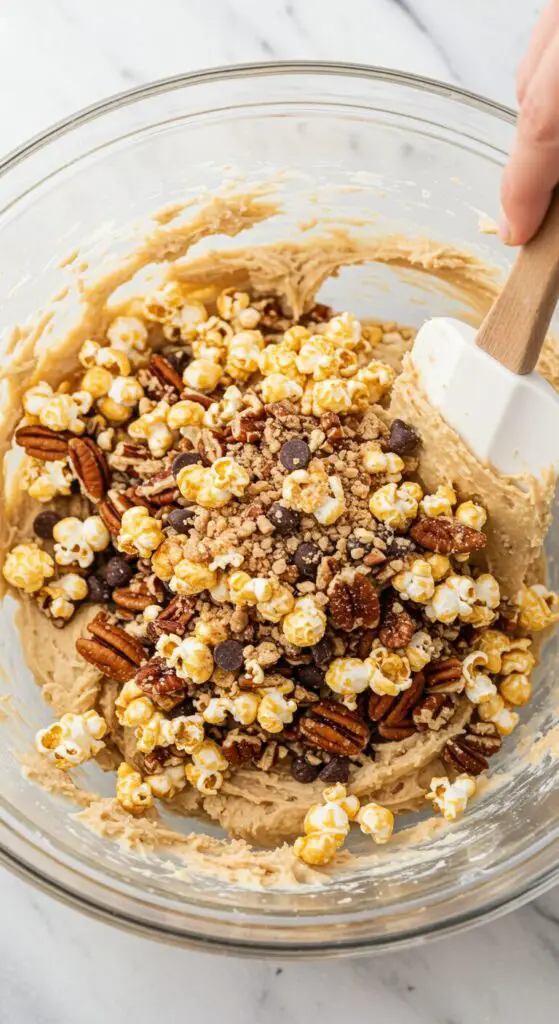 - Fold in the Goodies: Now for the fun part! Gently crush your popped popcorn with your hands into slightly smaller pieces. Stir the crushed popcorn, the chocolate chips, and the chopped pecans into the cookie dough until they are evenly distributed.