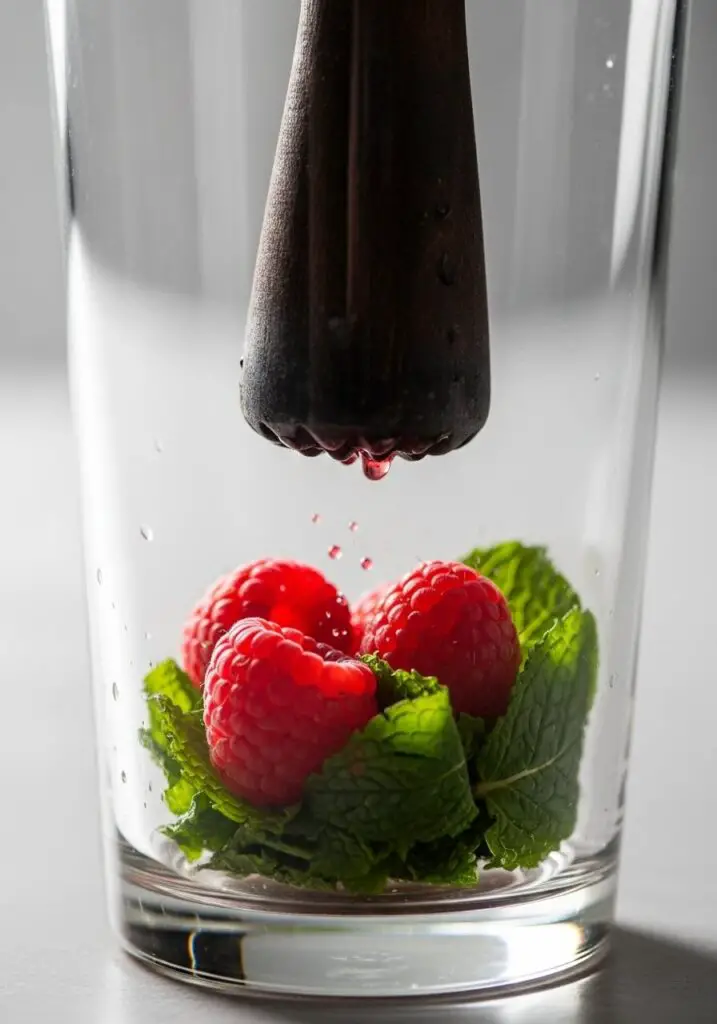 - In the bottom of a tall, sturdy glass, gently muddle the fresh raspberries and mint leaves to release their juices and oils.