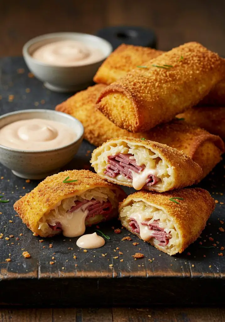 - Serve and Enjoy: Serve the Reuben egg rolls hot and crispy with the chilled Russian dressing on the side for dipping.