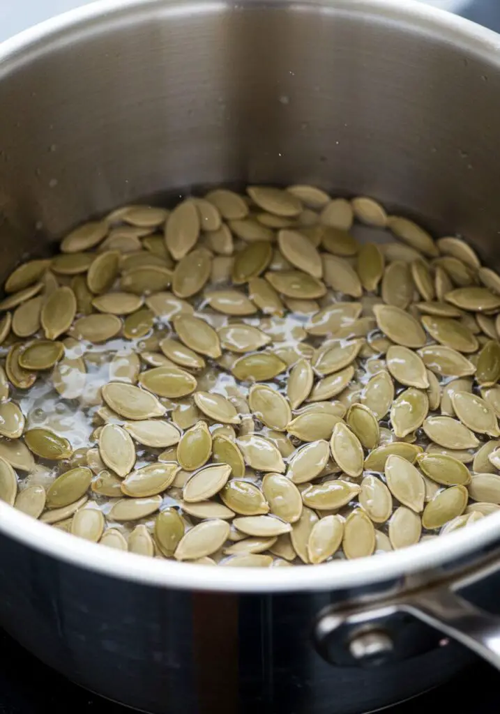 - The Secret Boiling Step: Fill a medium saucepan with 2 cups of water and add your 2 teaspoons of salt. Bring the salted water to a boil. Add your cleaned pumpkin seeds to the boiling water and let them simmer for 5 minutes.