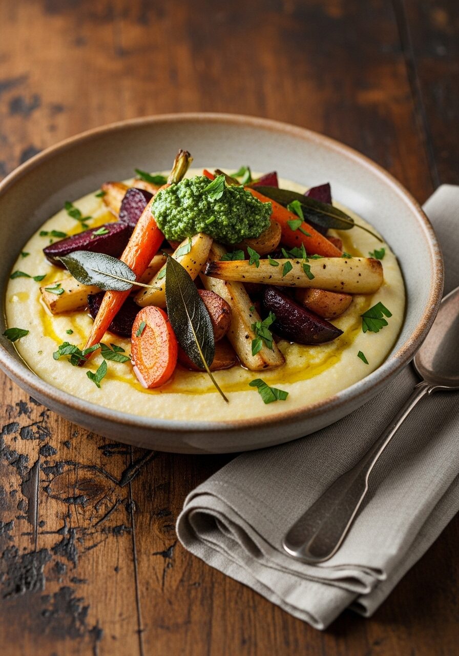 I promise you, there is no greater feeling than taking the first spoonful of this incredible dish. The creamy, slightly tangy polenta is the perfect canvas for the sweet, caramelized root vegetables, all brought to life with the fragrance of fresh sage and a final, vibrant dollop of pesto. It’s a complete, restaurant-worthy meal that comes together in about 35 minutes.