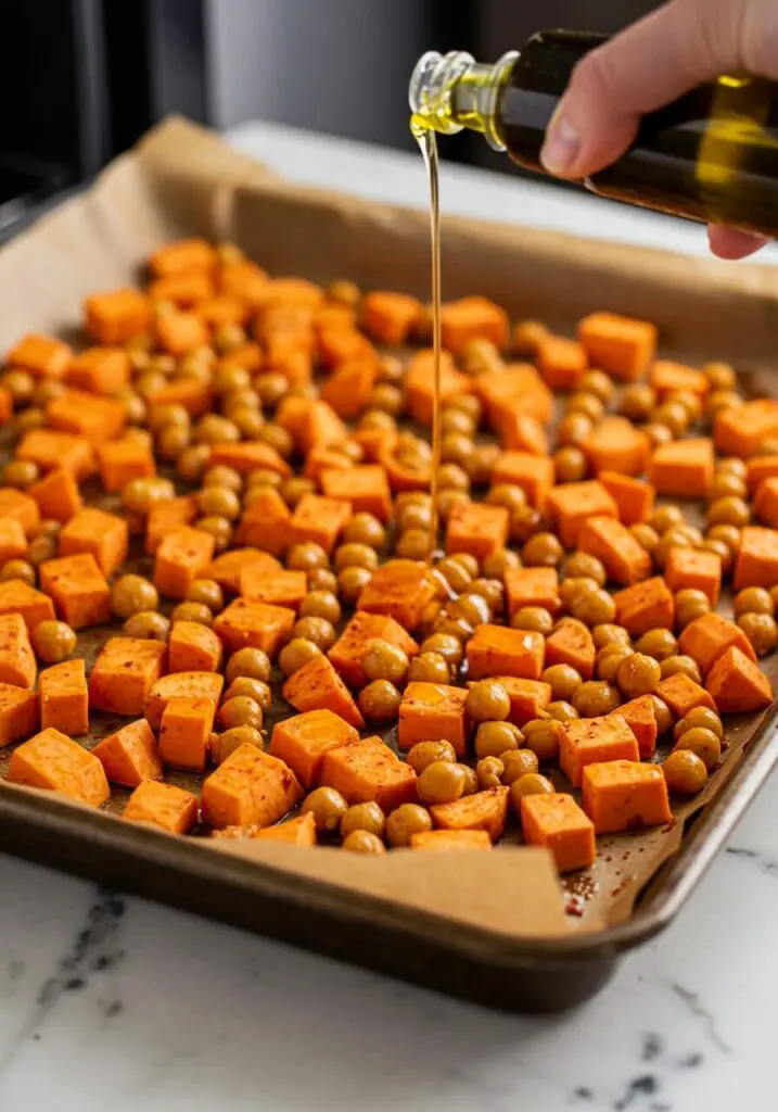 - Bake to Perfection: Spread the sweet potato and chickpea mixture out on the prepared baking sheet in a single, even layer. The single layer is key for crispy chickpeas! Season generously with salt and pepper. Bake for 30 minutes, or until the potatoes are tender and the chickpeas are lightly crispy.