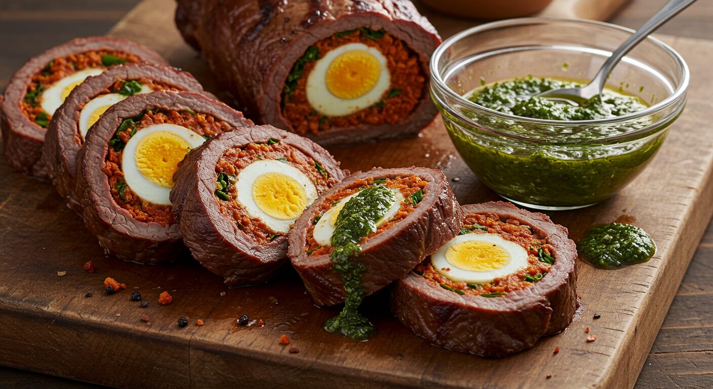 Imagine a tender flank steak, butterflied and pounded thin, then slathered with a savory herb paste and layered with a vibrant mosaic of spicy chorizo, hard-boiled eggs, carrots, and bell peppers. It’s then rolled up into a beautiful roulade, tied, and grilled to smoky, juicy perfection. Served with a bright, zesty, homemade chimichurri sauce, this is a meal that is bursting with incredible flavor and is guaranteed to be the talk of your next dinner party.