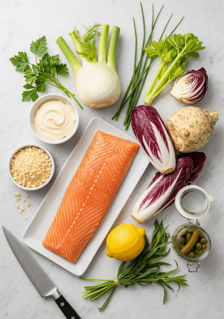 - 1 ¾ oz each of celery root, radicchio, and fennel → All julienned for a crisp, refreshing slaw.
