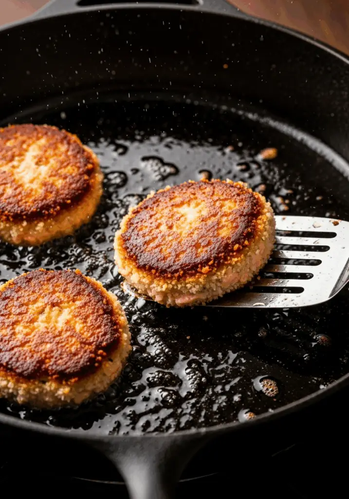 - Pan-Fry the Patties: Heat the vegetable oil in a large cast-iron skillet over medium-high heat until it shimmers. Carefully place the salmon patties in the hot oil. Cook for about 10 minutes total, flipping once or twice, until the crust is a deep golden brown and the inside is medium-rare (about 115-120°F). Adjust the heat as needed to prevent the crust from burning.