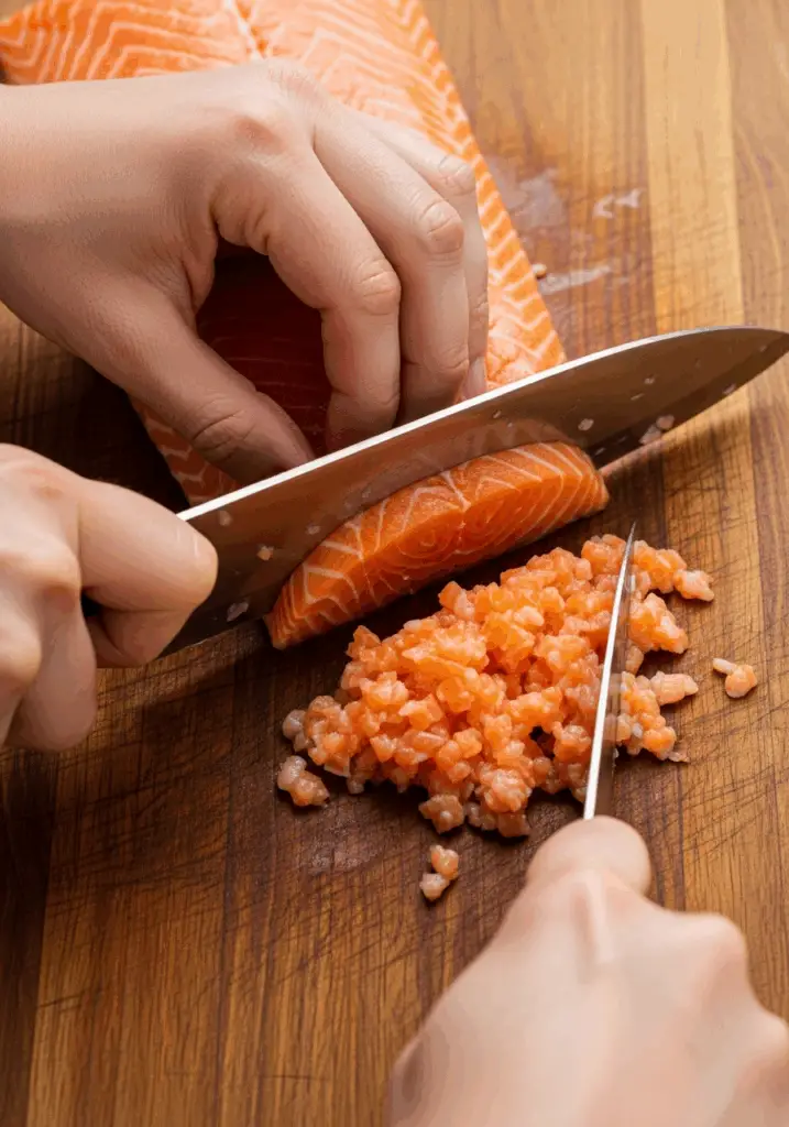 - 1 ½ pounds boneless, skinless salmon → Finely chopped by hand.