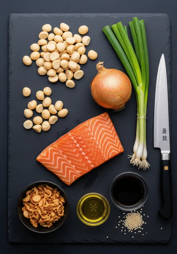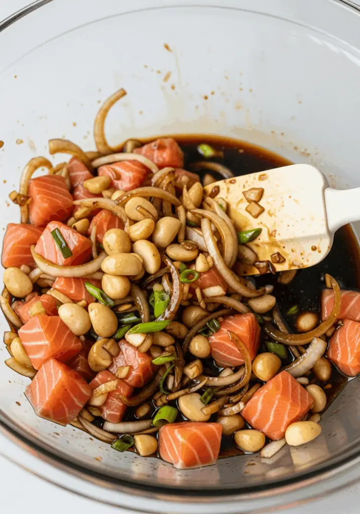 - Combine Everything: In a large bowl, combine the toasted macadamia nuts, the cubed sashimi-grade salmon, the diced sweet onion, sliced scallion, sesame seeds, and fried shallots.