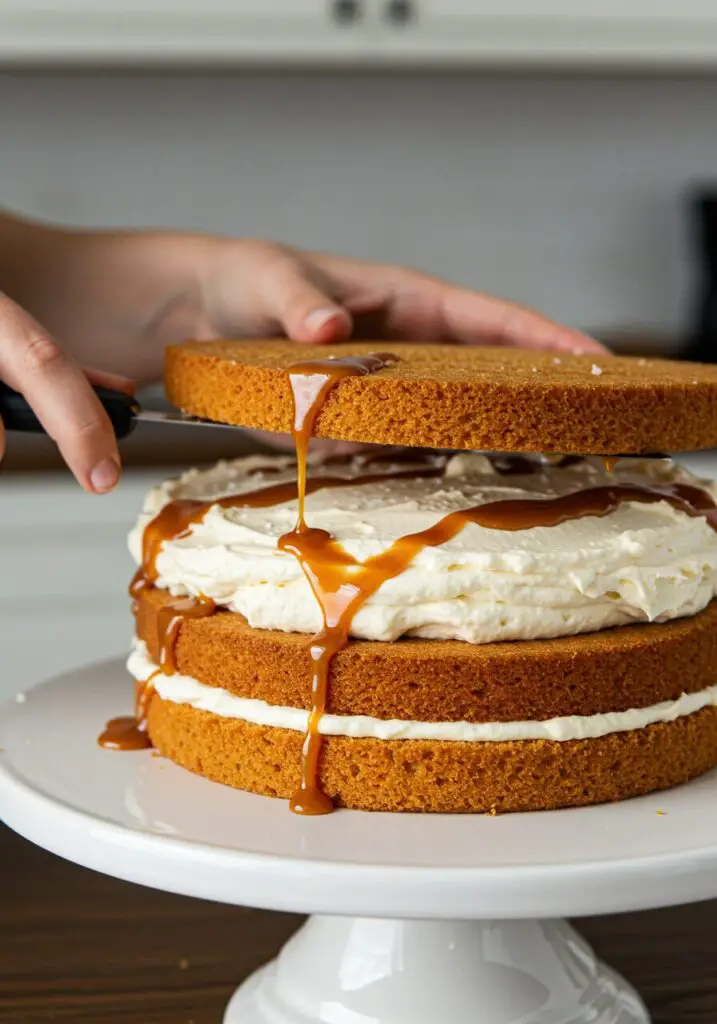 - Layer & Fill Cake: Place one cooled cake layer on a cake serving plate or stand. Spread the top with 1 tablespoon of the remaining salted caramel (from step 11 – the portion not used in the frosting). Then, spread 3 tablespoons of the prepared buttercream frosting over the caramel. Top with another cake layer and repeat the spreading with caramel and buttercream. Finish with the third cake layer.