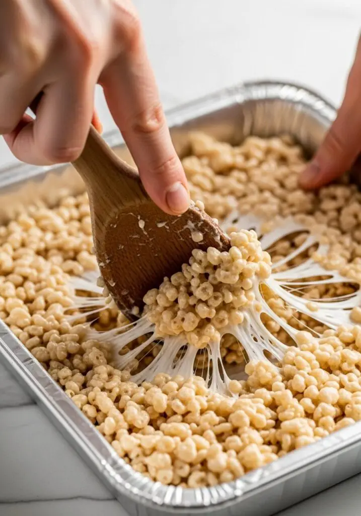 - Combine and Press: Remove from the heat and add the crispy rice cereal. Stir until everything is fully combined. Transfer the warm mixture to your prepared pan and use the back of your greased spoon or a piece of greased wax paper to press it into a firm, even layer. Let it sit at room temperature for about 20 minutes to firm up.