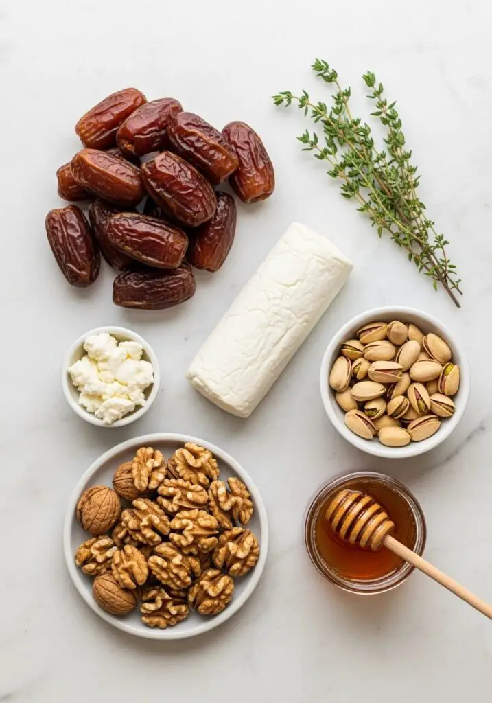 - Arrange the dates on a serving platter. Just before serving, lightly drizzle with honey and sprinkle with fresh thyme.