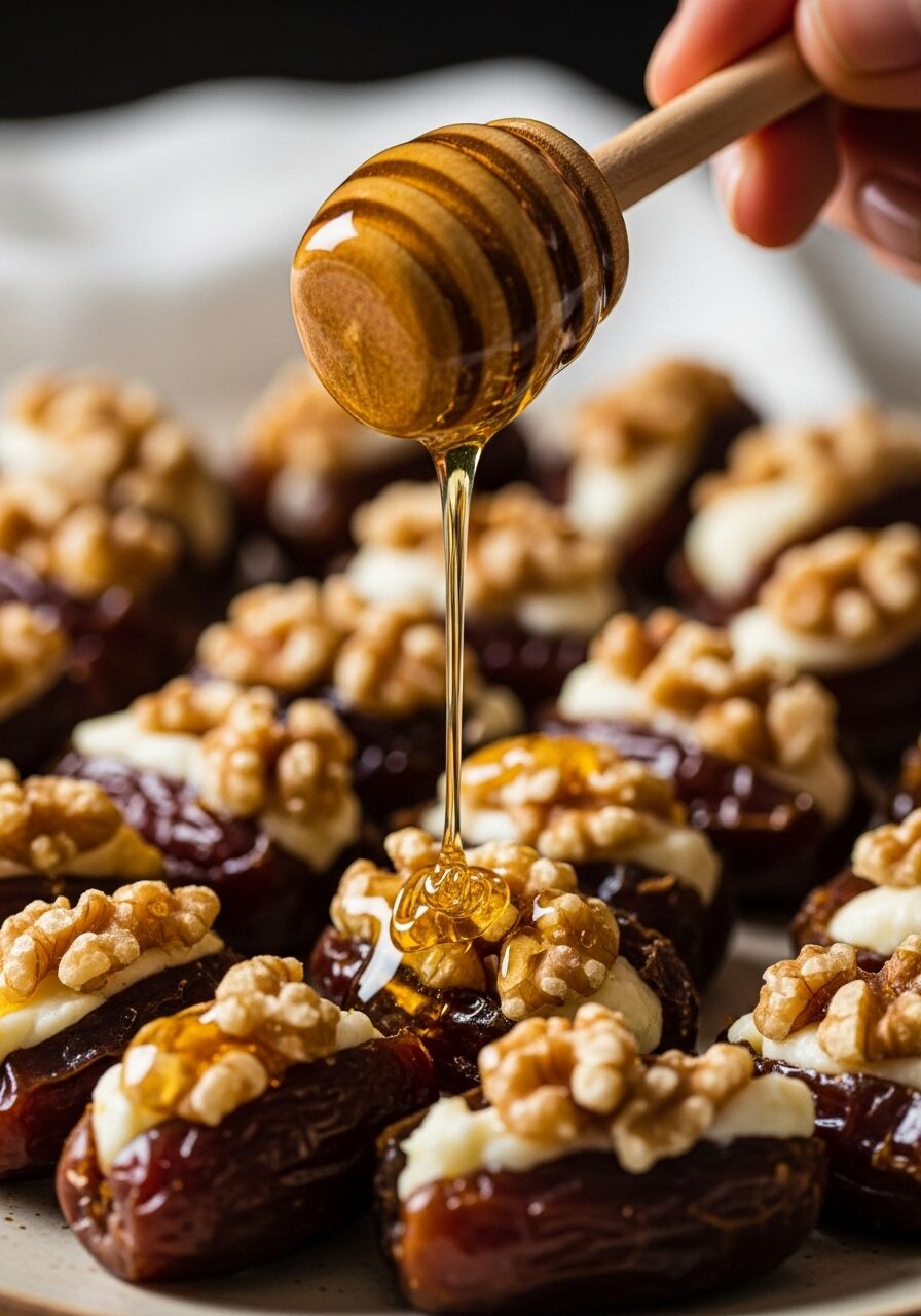 - The Final Flourish. Arrange the stuffed dates on your final serving platter. Just before serving, lightly drizzle a little honey over the top of all the dates.