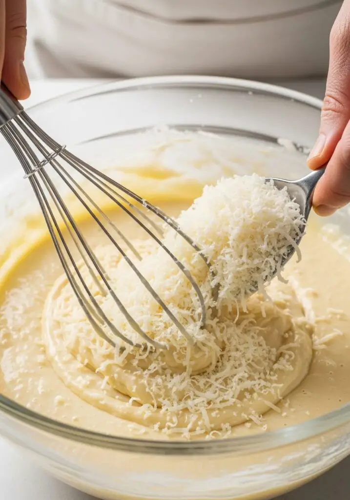 - Mix the Batter: In a large bowl, whisk together the flour, sugar, baking powder, baking soda, and salt. In a separate medium bowl, whisk the milk, egg, and vegetable oil. Gradually pour the wet ingredients into the dry ingredients, whisking until just combined (a few small lumps are okay!). Gently fold in the grated Parmesan cheese.