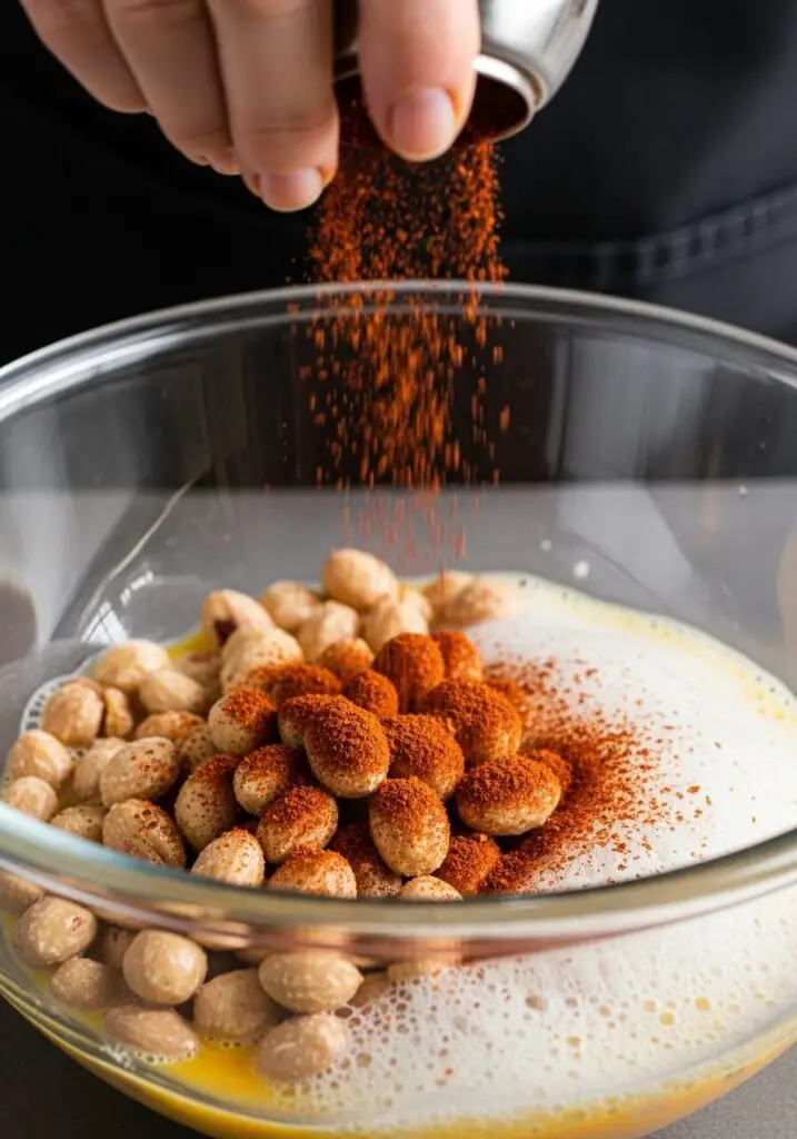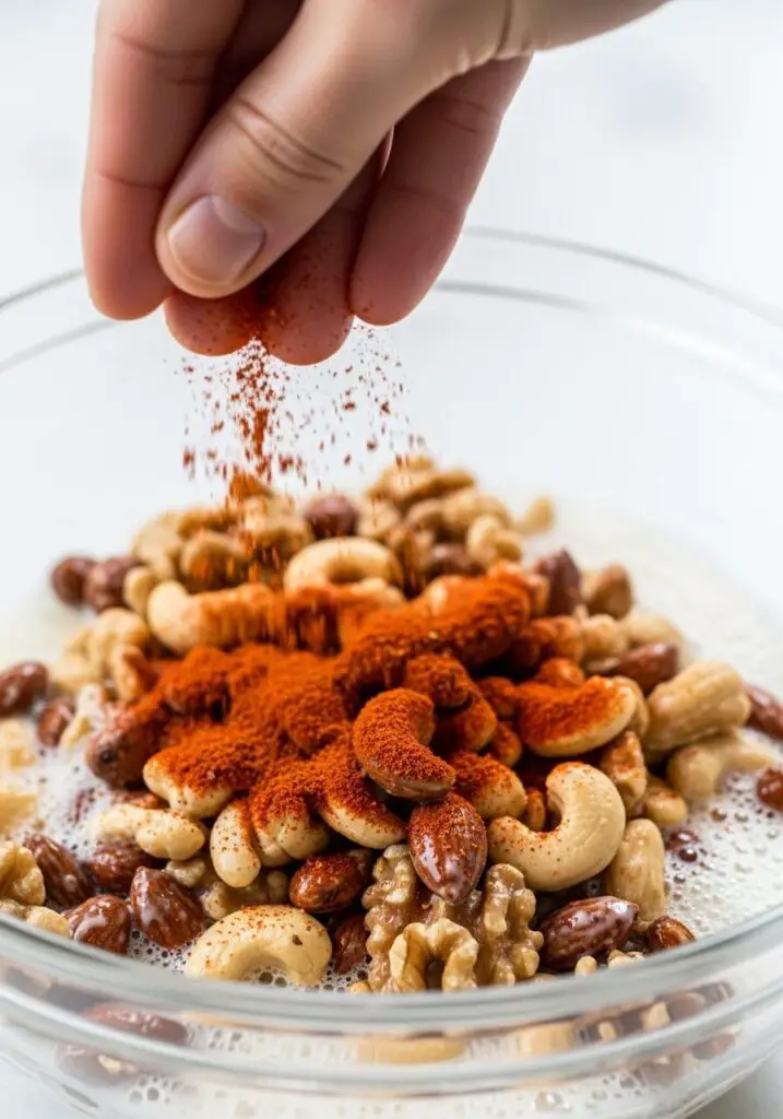 - Add the Spices. Sprinkle the spice mixture over the coated nuts and toss again, very thoroughly, until every nut is completely covered in the seasoning blend.