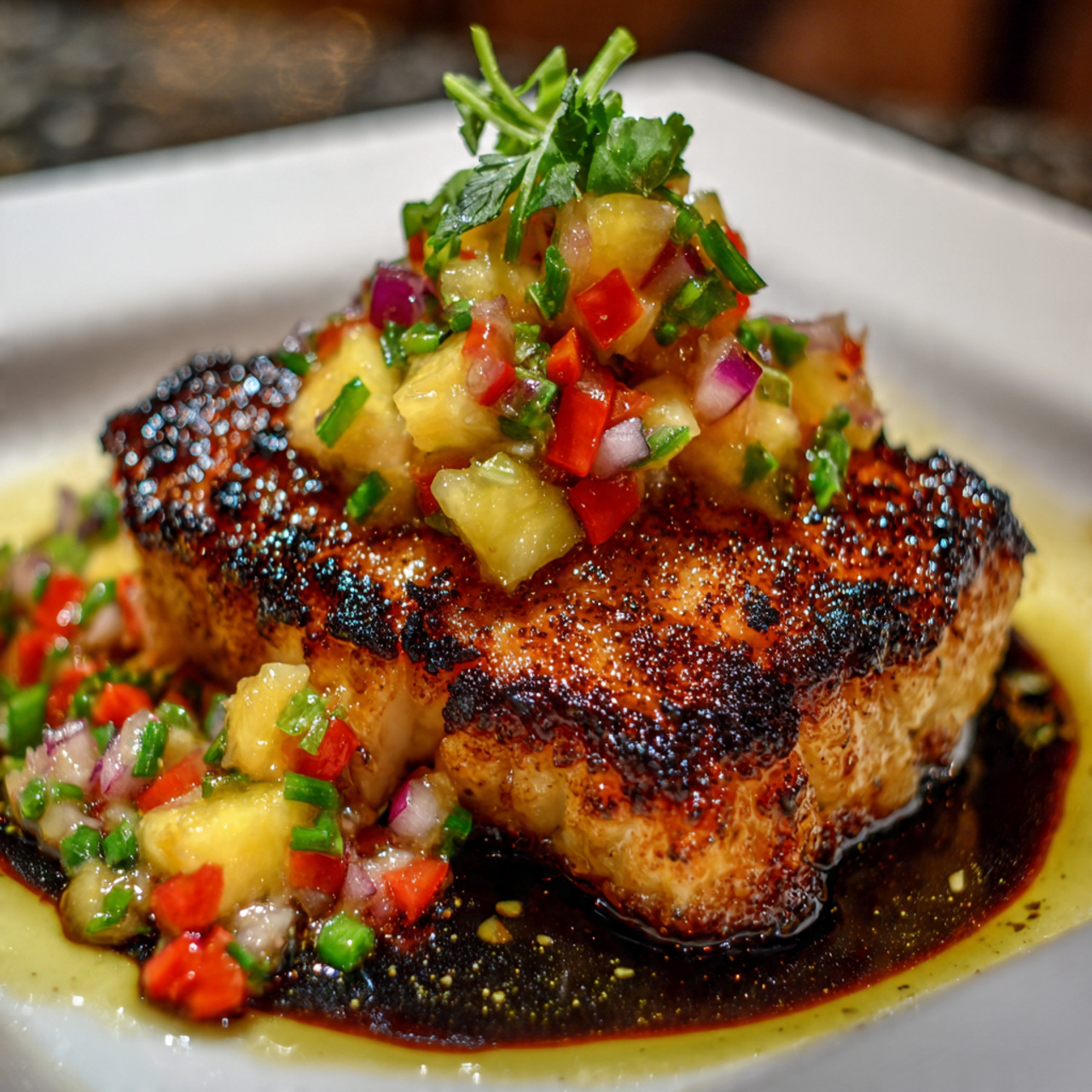 - To serve, spoon the warm glaze over the seared fish and top with a generous amount of the pineapple salsa.
