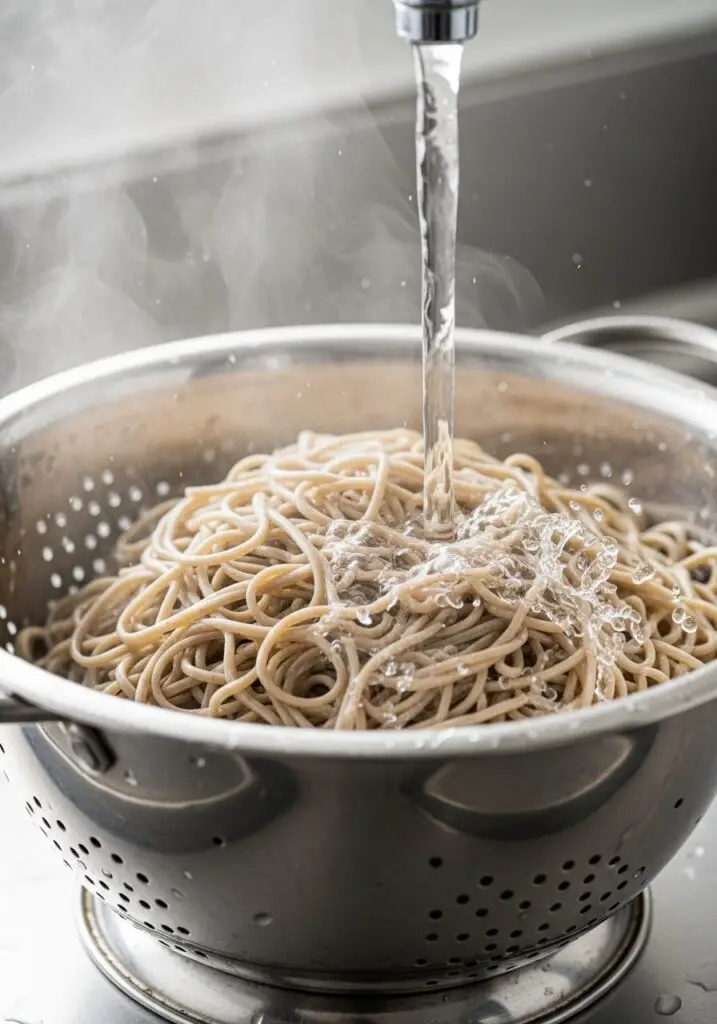 - Drain the noodles in a colander and rinse very well under cold running water, using your hands to toss them. This removes starches and prevents clumping.