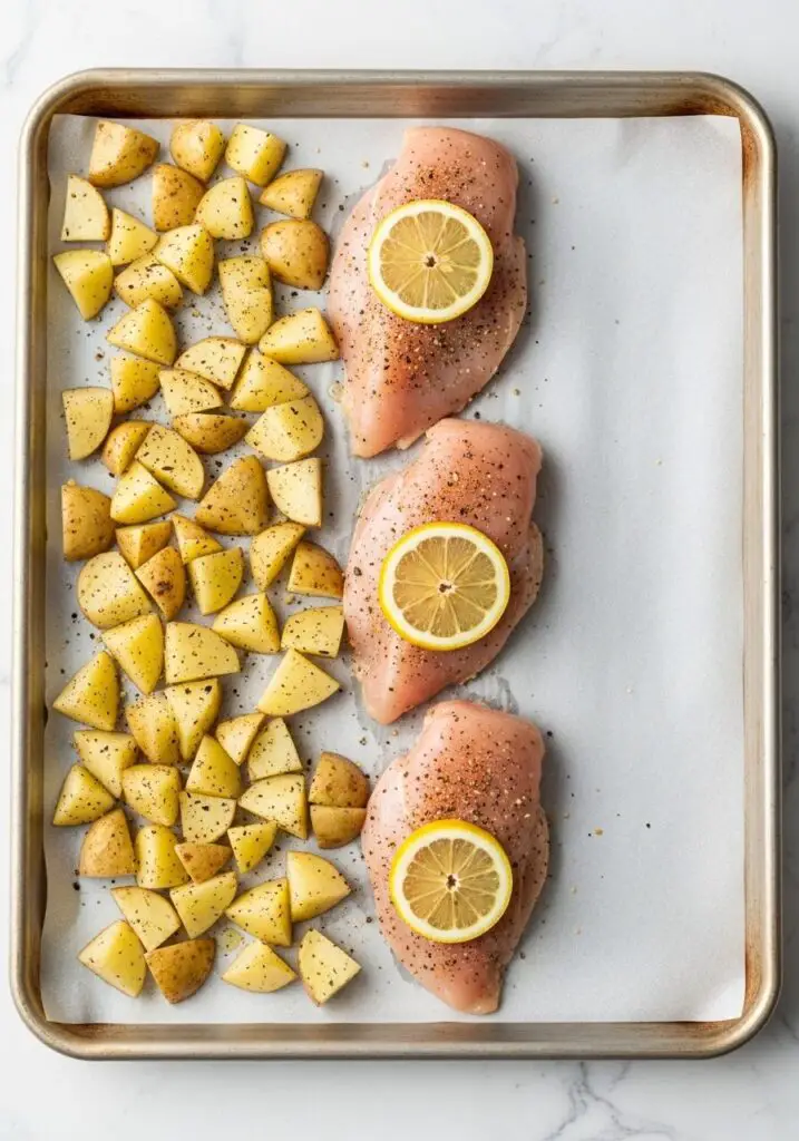 - Spread the potatoes in a single layer on one side of the baking sheet. Place the seasoned chicken breasts in the center. If using, add lemon slices on top of the chicken.