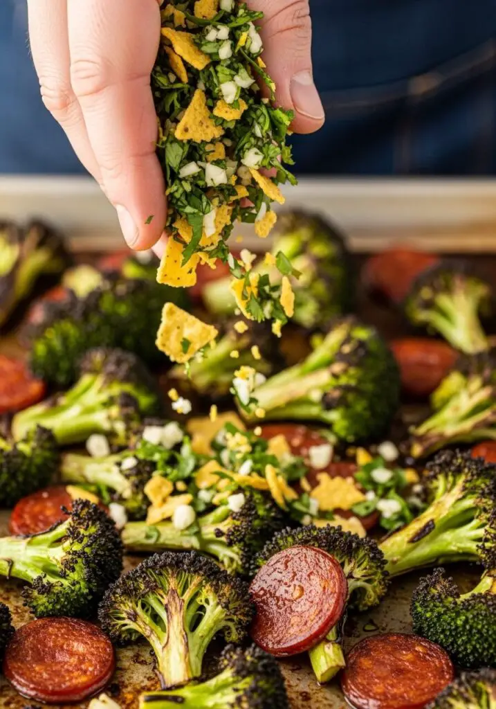 - Final Toast: Sprinkle the tortilla chip gremolata evenly over the hot broccoli and chorizo on the sheet pan. Return the pan to the oven for just 2 more minutes to lightly toast the chips and make them extra fragrant and crunchy.