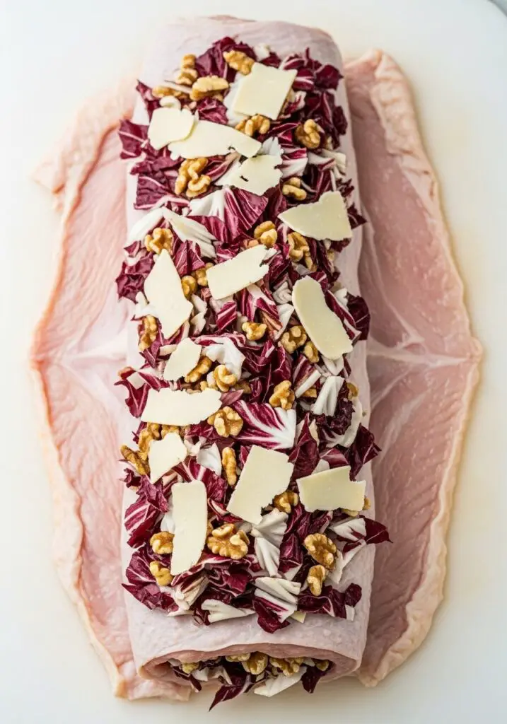 - Layer the Filling. Sprinkle the turkey flesh with the fresh rosemary. Layer the speck evenly over the top. Follow with an even layer of Parmesan cheese, toasted walnuts, 2/3 cup of the parsley, and finally, the cooled radicchio mixture.