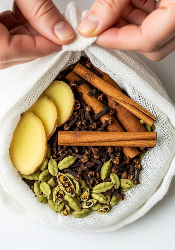 - Create the Spice Bag: Place all your whole spices and the fresh ginger slices onto a large, double-thickened square of cheesecloth. Gather the corners up to enclose all the seasonings and tie it securely with kitchen string to create a little spice bag (or “bouquet garni”).
