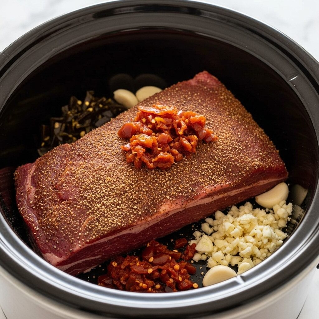 - Add to Slow Cooker: Place the seasoned brisket, along with the 2 minced chipotle chiles in adobo sauce and 3 smashed garlic cloves, into a 6-quart slow cooker.