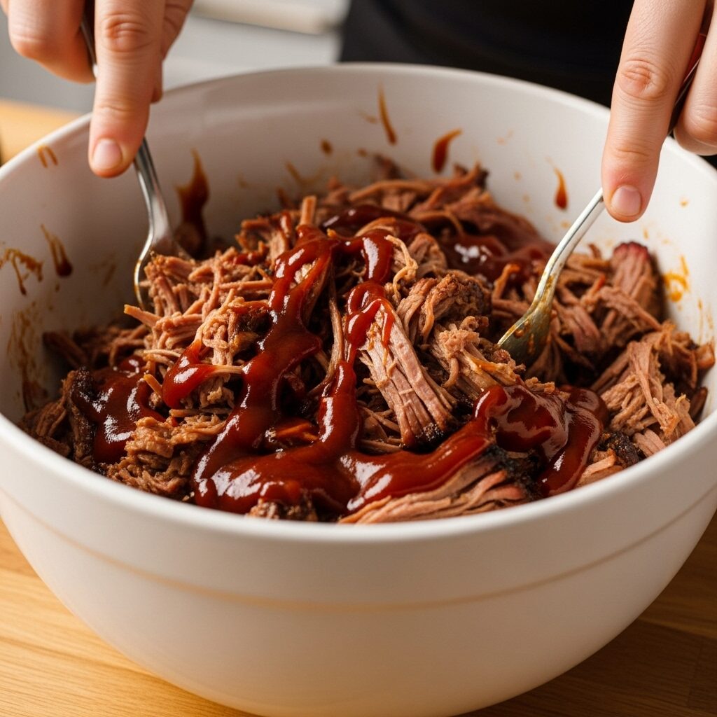 - Coat with Sauce: Add the 1 cup barbecue sauce and the reserved ½ cup cooking liquid to the shredded brisket. Stir everything thoroughly until the meat is fully coated in that rich, smoky BBQ sauce.