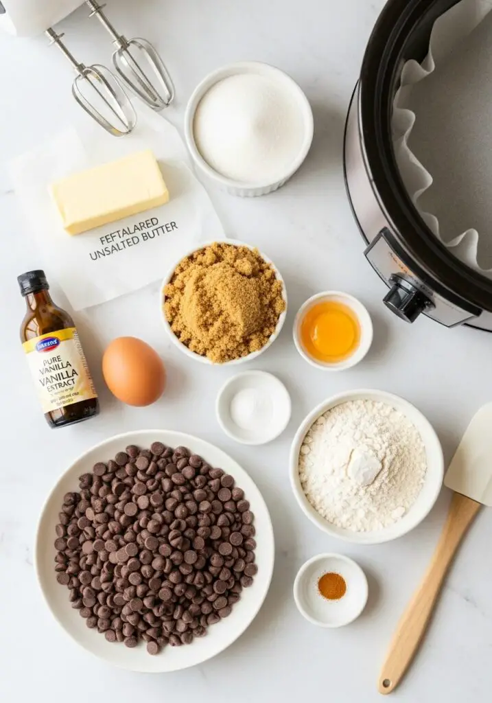 Creating this incredible Slow Cooker Chocolate Chip Cookie uses simple, classic baking ingredients. Here’s what you’ll want to grab to get started!