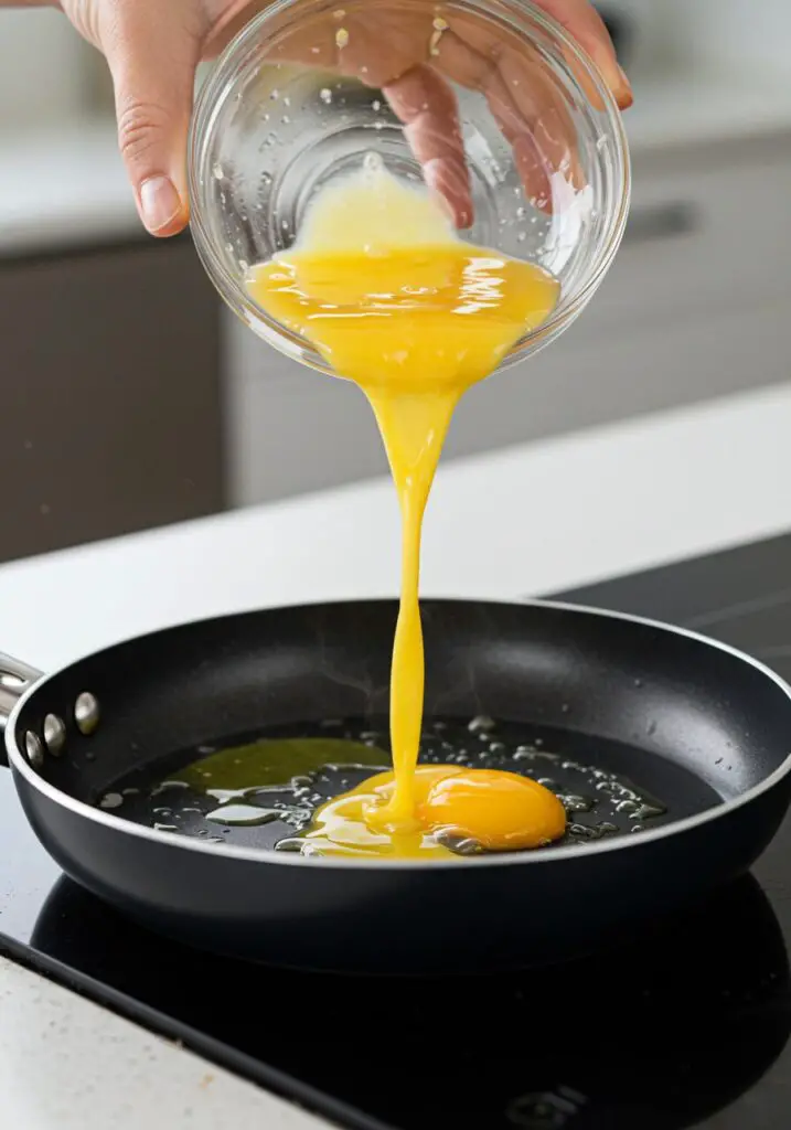 - Prep the Eggs: First, crack the 4 large eggs into a small mixing bowl. Season them with a big pinch of kosher salt and add 1 teaspoon of olive oil. Whisk everything together until the yolks and whites are fully combined and slightly frothy.