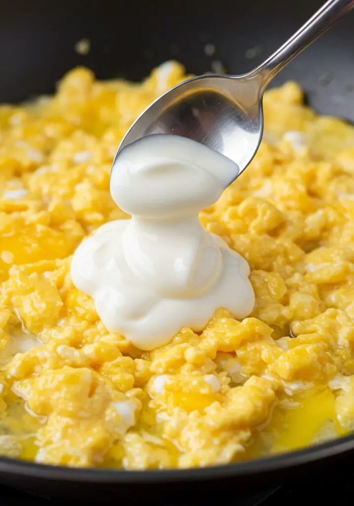 - The Secret Ingredient: Now for the magic! Immediately turn off the heat. Add the Greek yogurt to the pan with the eggs.