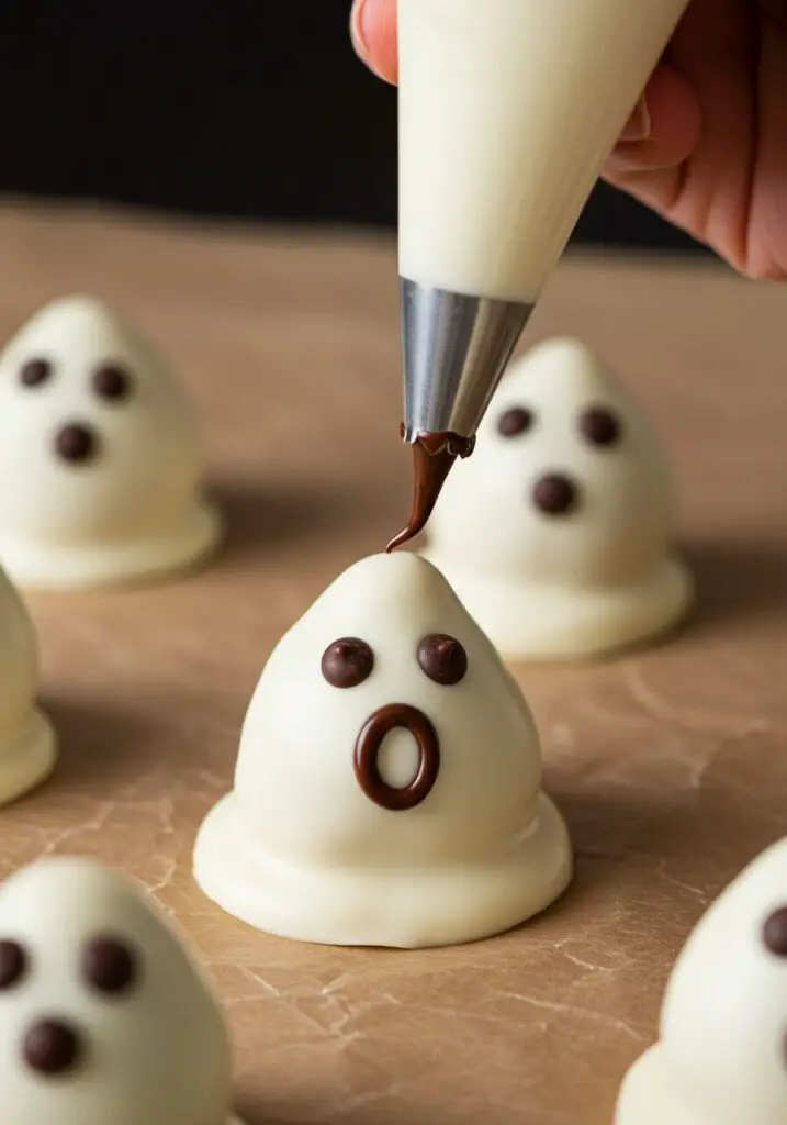 - Pipe the Mouths and Final Chill: Melt the regular chocolate chips in a separate small bowl. Transfer the melted chocolate to a small zip-top bag and snip off a tiny corner, or use a piping bag with a very small round tip. Take the chilled strawberries out of the fridge and pipe spooky (or happy, or scared!) mouths onto each ghost.