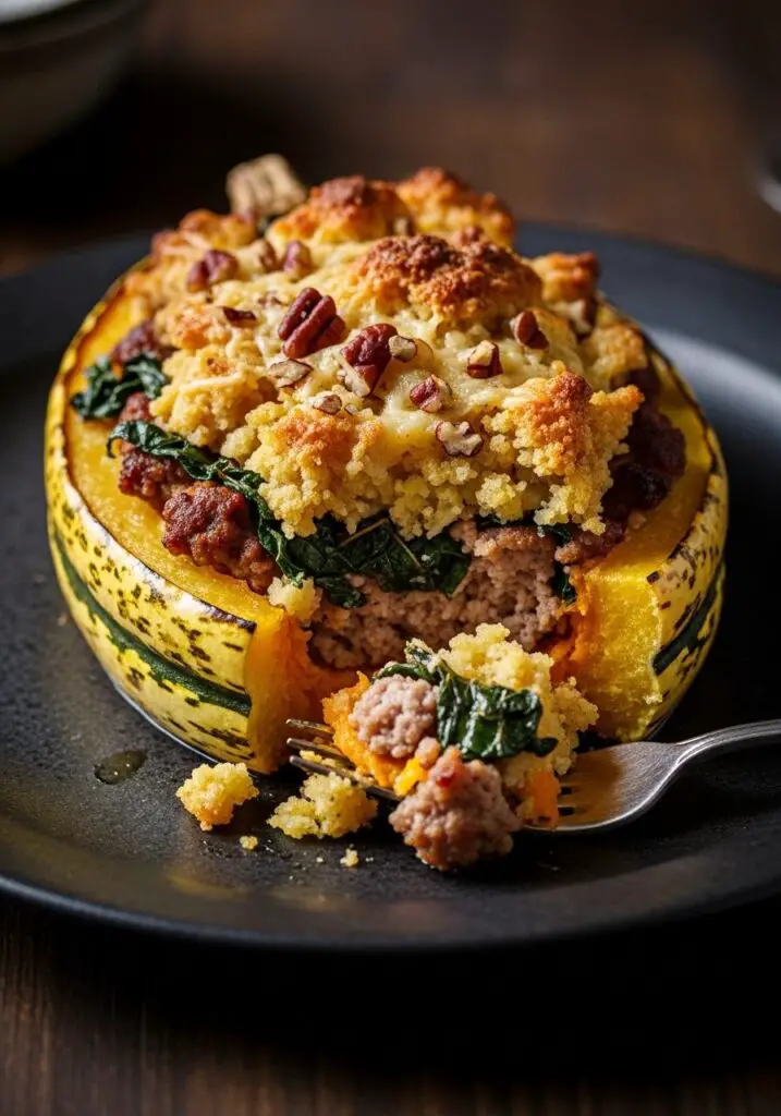 There is a special kind of magic that arrives with the first chilly days of fall, and for me, it tastes exactly like this Stuffed Delicata Squash. Imagine a tender, sweet, and beautifully roasted squash, its edible skin a gorgeous striped pattern, filled to the brim with a savory, spicy Italian sausage and chard mixture, and topped with a crispy, cheesy cornbread and pecan crust. It is, simply put, autumn in a boat.