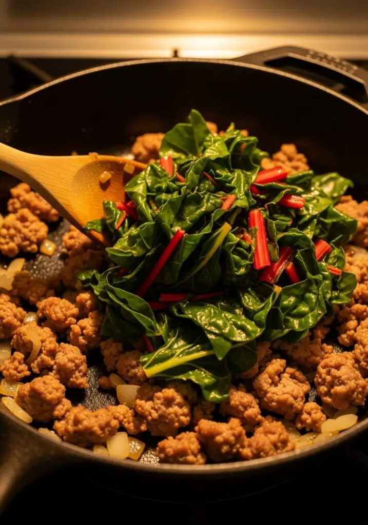 - Wilt the Chard: Add the chopped chard leaves and the ¼ cup of water or stock to the skillet. Stir, cover the pan, and let it cook for about 3-4 minutes, just until the chard has wilted down into the sausage mixture. Uncover and stir until any excess liquid has evaporated.