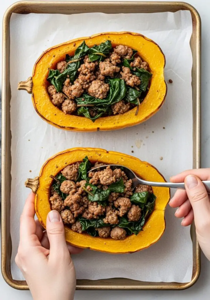 - Spoon the sausage mixture evenly into the roasted squash halves.